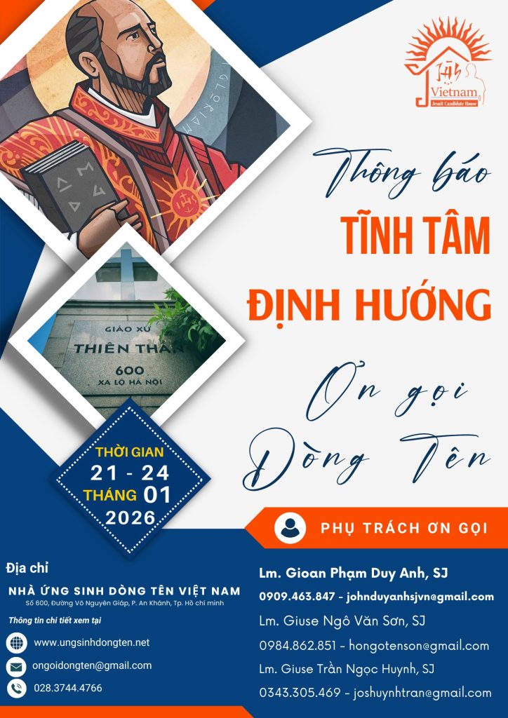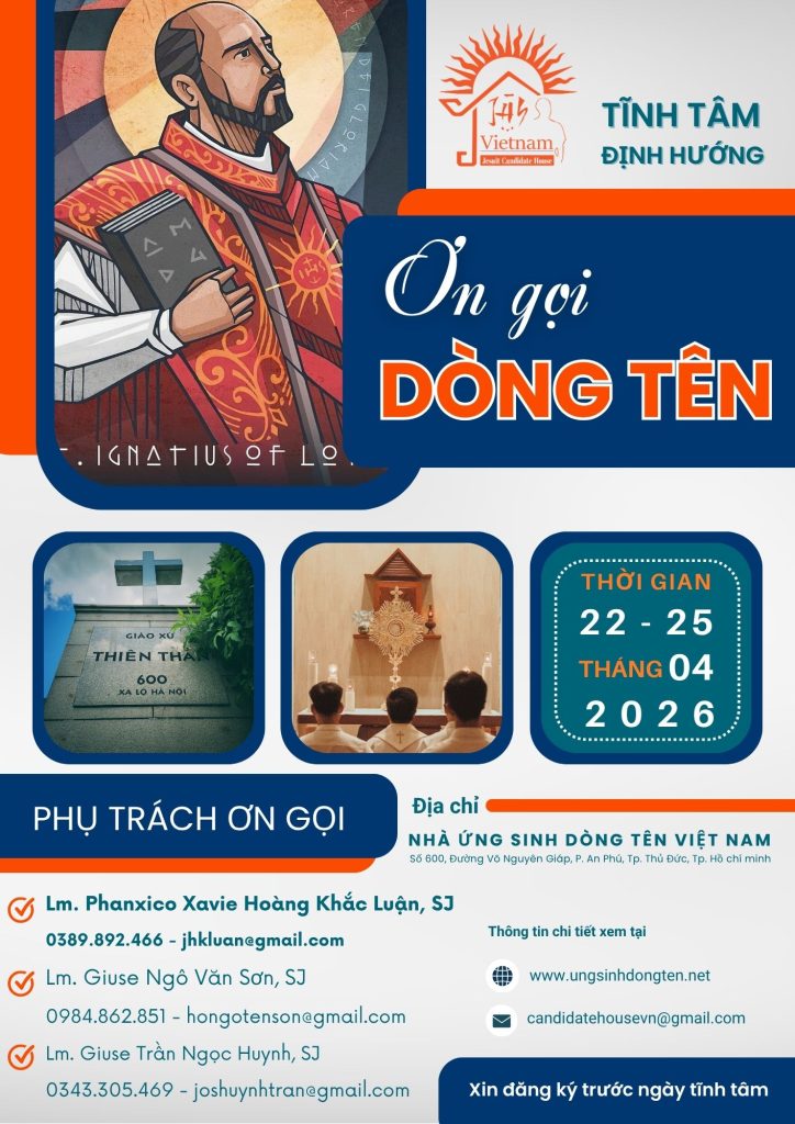 Nhằm giúp các bạn nam Công giáo, phân định ơn gọi đời sống thánh hiến theo Linh đạo Dòng Tên Việt Nam, Nhà Ứng Sinh Dòng Tên tổ chức khóa Tĩnh tâm Định hướng ơn gọi Dòng Tên. – Tham dự viên: Nam thanh niên Công giáo, trình độ học...