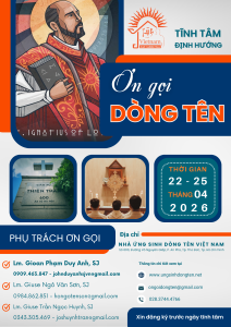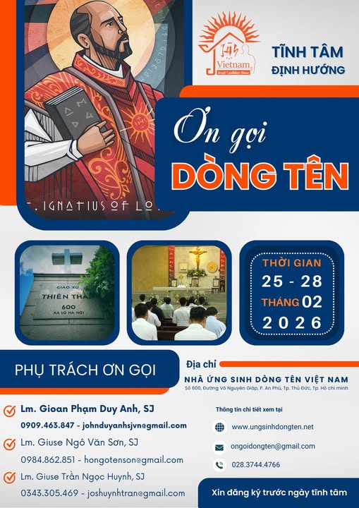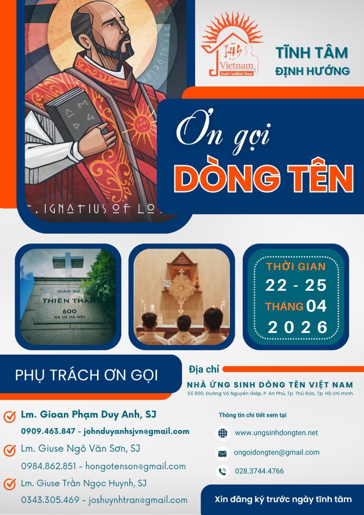 Nhằm giúp các bạn nam Công giáo, phân định ơn gọi đời sống thánh hiến theo Linh đạo Dòng Tên Việt Nam, Nhà Ứng Sinh Dòng Tên tổ chức khóa Tĩnh tâm Định hướng ơn gọi Dòng Tên.– Tham dự viên: Nam thanh niên Công giáo, trình độ học vấn...